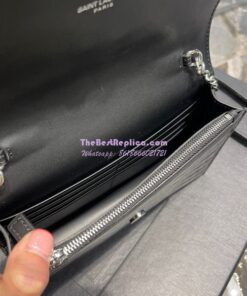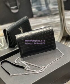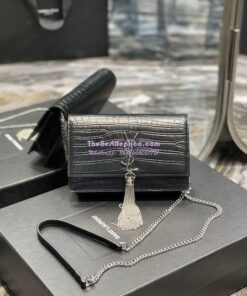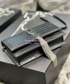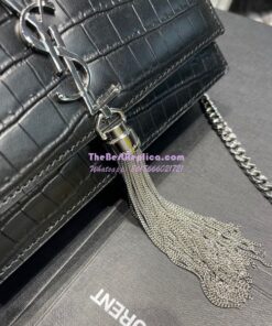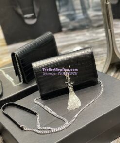 Replica YSL Saint Laurent Kate Chain Wallet With Tassel In Crocodile-embossed Matte Leather 452159 Black Silver Hardware